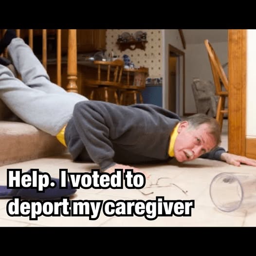 So yes, no one will be there to wipe your butt, to fix your food, to help you up when you fall. but even if you dont need any help with this, you might not appreciate the shortages in staffing at all manner of service, construction, and agriculture, you might miss the $100 billion in taxes, you might hate the 15%-20% increase in the cost of almost everything, even if you dont appreciate the cultural and creativity in art and food and music. you are gonna miss the 15 million folks certain racist politicians are willing to kick out of our country.